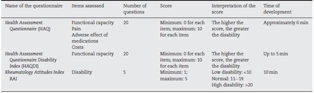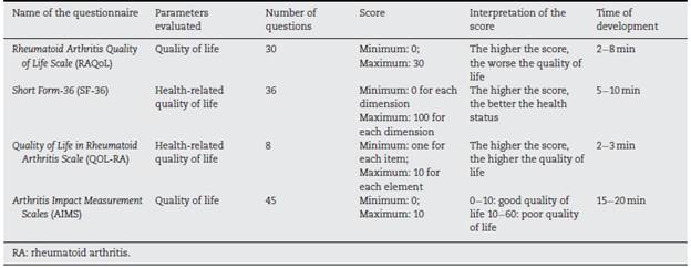 These instruments are particularly useful in patients with RA. This is a condition that can have a negative impact on quality of life (4 questionnaires). (40 In this domain, the ques tionnaires vary in the number of questions, but they coincide in evaluating the physical, social and mental environment according to the patient's self-perception, giving a score that is related to better or worse quality of life.