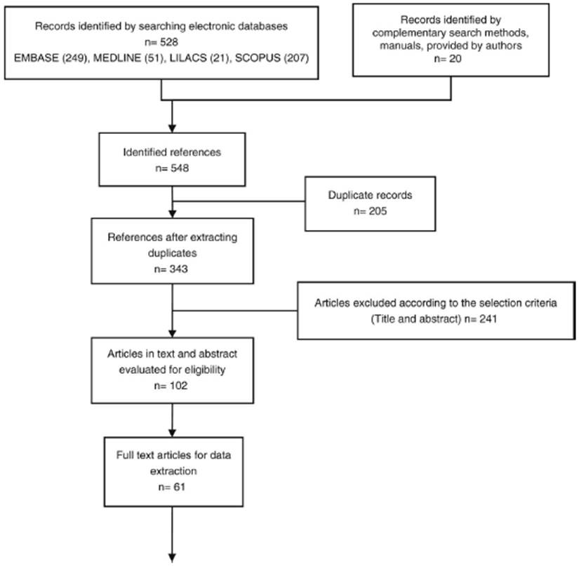 In the screening and selection activity, 528 references were obtained after removing intrabase and interbase duplicates (n= 343). After the review by title and abstract, 102 references were obtained that were evaluated in the full text version, of which 61 original articles were used for data collection and extraction.