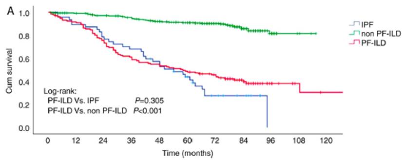 Faverio et al. (20 discovered similar differences in non-IPF-ILD without PPF, with a median survival time of 6 years and a mortality rate of 15% at 5 years, in comparison to patients with PPF who had a median 3-year survival time and mortality rates of 4 and 20% at 2 and 3 years, respectively.