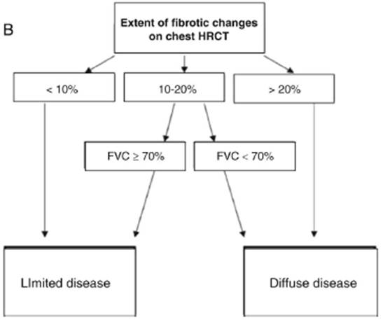 Fig. 4 Definition of extensive and limited disease in SSc-ILD. HRCT: high-resolution axial tomography; FVC: forced vital capacity.