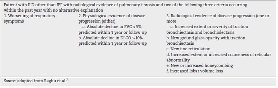 In the particular case of systemic sclerosis, the progression of the disease is defined as a decrease in FVC of ≥10%, or a reduction in FVC of 5-9% in combination with a decreased DLCO of ≥15%, as shown in Fig. 5. Therefore, it is essential to validate in this population the recently proposed criteria for progressive pulmonary fibrosis. (38