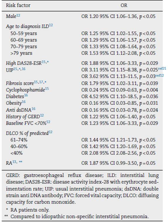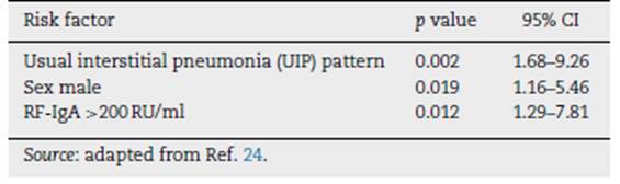 Since a large number of people with RA develop pulmonary fibrosis, and the rate of progression is high in this group, it is vital to diagnose RA-ILD as soon as possible. Risk factors for RA-ILD have been described, such as smoking history, older age, male sex, long duration of disease, high articular activity, high levels of rheumatoid factor (RF) and citrulline peptide antibodies. (23,24 Chen et al. identified some risk factors for RA-ILD progression in 75 RA patients, with statistical significance in multivariate analysis, presented in Table 6.