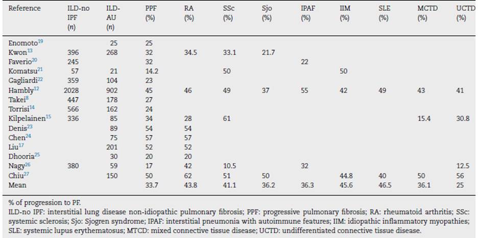 Other CTD as Sjogren syndrome, inflammatory myopathies, MTCT and UCTD are related with ILD and progressive fibrosis. There is not enough evidence to stablish the prevalence and characteristics of this condition in this population, data is usually extra polled from the RA-ILD and SSC-ILD studies.