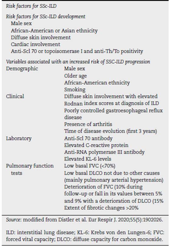 In Table 5, risk factors related to the development and progression of SSc-ILD are listed. (35