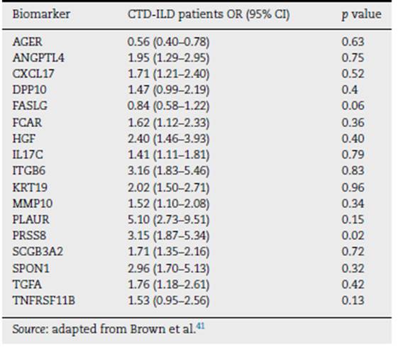 There are already biomarkers related to CTD-ILD and progression to fibrosis, such as CXCL13, CA-125, MMP7, YKL-40, SP-D, VCAM and KL-6. (41 Bowman et al. identified and validated 17 plasma biomarkers associated with PPF independently of the etiology. A proteomic signature with 12 biomarkers was developed; patients with a "high risk" proteomic signature had more decline in FVC in the next year versus "low-risk patients" (85.7 ml vs. 227.1 ml, respectively), and patients with the high-risk proteomic signature had an almost seven-fold higher risk of progressive fibrosing ILD compared with the low-risk signature (OR 6.73, 95% CI 4.00-11.33). This study was done with a validation cohort of 204 ILD patients (21 with RA) and a discovery cohort of 385 ILD patients (38 with RA). (41