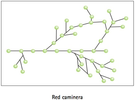 En la misma dirección, al dibujar el grafo que arma la estructura del sistema telegráfico (telégrafo alámbrico), se confirma con mayor rigor esa conectividad comunicacional en la que se ha venido insistiendo, más aún si se superpone al de los otros medios analizados aquí: fluvial, ferrocarriles/cables, correos (caminos). El grafo permite apreciar la conformación de una red arborescente que se volvió cada vez más tupida, en la medida en que se fueron ampliando las instalaciones en localidades de menor jerarquía en la escala regional. En las redes arborescentes (ej. un árbol), un nodo solo recibe una conexión y todo nodo del árbol puede ser considerado como raíz o punto de partida para seguir sucesivamente todas las cadenas del árbol.13