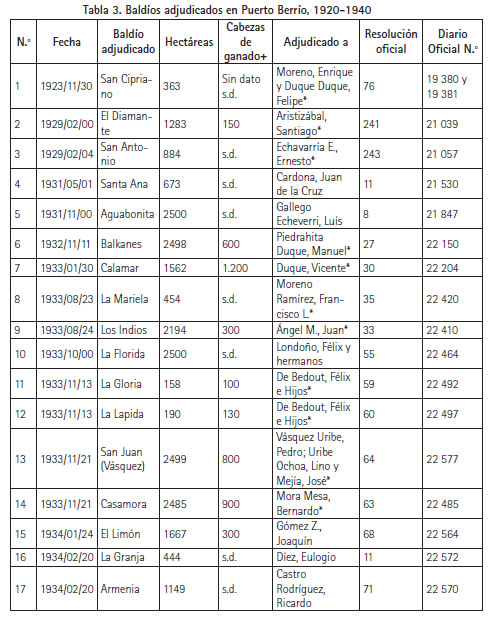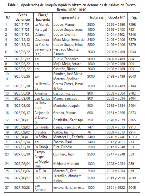 Catherine LeGrand presenta un dato según el cual en Puerto Berrío de 1870 a 1931 fueron otorgadas 28 adjudicaciones de 27 191 hectáreas, la mayoría de las cuales –19 006– se repartieron entre 1918 y 1931.41 En una revisión de la GacetaDepartamental de Antioquia y del Diario Oficial en sus ediciones de 1920 a 1940, fue factible hallar denuncios y adjudicaciones que permiten ampliar las cifras ofrecidas en ese estudio.