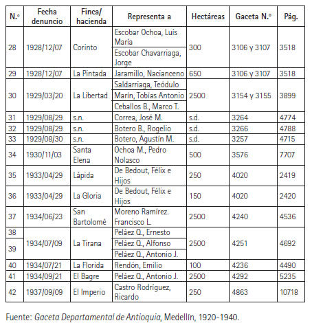 En la Gaceta Departamental entre 1920 y 1940 fue posible ubicar detalles de cuarenta y dos denuncias en las que se solicitó la titulación de más de 57 500 hectáreas (ver tabla 1).