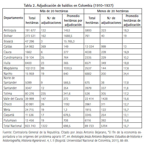 Bejarano afirma que entre 1910 y 1937 el Estado adjudicó un total de 1 013 466 hectáreas (ver tabla 2), de las cuales 923 745 (91.16%) fueron repartidas en extensiones superiores a las 20 hectáreas y apenas 89 723 (8,84%) fueron adjudicaciones a pequeños propietarios. Por ello, deduce que el latifundio se fortaleció a costa de las tierras públicas. Este proceso era más evidente en los departamentos en los que las vías de comunicación habían avanzado con rapidez y en los que sin duda se concentraban las mayores magnitudes del mercado, entre ellos Antioquia, donde, por ejemplo, de las 132 adjudicaciones superiores a 20 hectáreas hechas en ese periodo, 129 fueron de más de 1000 hectáreas.39 El promedio de hectáreas por adjudicación en ese periodo en Antioquia fue de 1453, cifra que corresponde al 97% del total adjudicado.