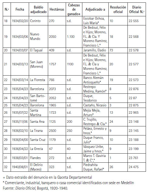Este acelerado e intenso proceso de adjudicación de baldíos también coincide con la terminación del tramo Puerto Berrío-Medellín del Ferrocarril de Antioquia (1929), que impulsó la titulación de estas tierras valorizadas con la creciente dinámica económica y con las facilidades propias de un medio de transporte como este.