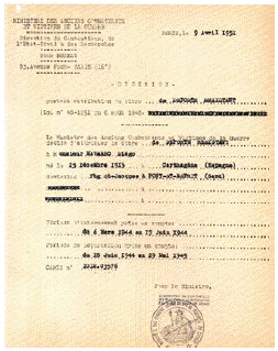 El siguiente documento está precisamente firmado por el ministro competente. La atribución de deportado resistente es un diploma con las fechas de internamiento y movilización. Se puede consultar en ambos expedientes: