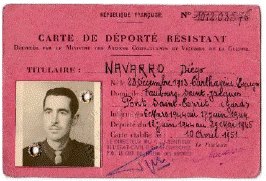 "Diego Navarro ha servido a las Fuerzas Francesas del Interior escondiendo armas y combatiendo en Pont Saint Esprit del 1 de enero de 1943 al 5 de marzo de 1944. Fue arrestado por el enemigo e internado de manera sucesiva en Pont Saint Esprit, Nimes, Marsella y Compiègne. Deportado a Dachau el 18 de junio de 1944, fue repatriado el 30 de mayo de 1945. Este atestado constituye un certificado de permanencia al cuerpo".