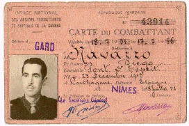 "Diego Navarro, nacido el 23 de diciembre de 1913 en Cartagena, España. Nacionalidad francesa. Dirección en el momento del arresto: plaza de Georges Ville, en Pont Saint Esprit, departamento de Gard. Decoraciones de guerra; medalla de la Resistencia, concedida el 11 de julio de 194619. Domicilio y situación civil en el momento de la solicitud: casado, barrio Faubourg Saint Jacques en Pont Saint Esprit, departamento de Gard". La documentación de Vincennes nos aporta como dato la homologación de miembro de las FFI en grado de sargento jefe y pensionado en grado militar al 100 %.