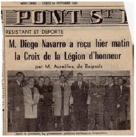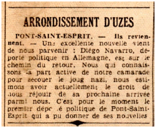 "Pont Saint Esprit. Ellos vuelven: Acabamos de recibir excelentes noticias: Diego Navarro, deportado político en Alemania, está de regreso. Quienes conocemos la parte activa de nuestro compañero para quitarnos el yugo nazi, sentimos que tenemos derecho a celebrar su próxima llegada entre nosotros. Por el momento, es la primera deportación política de Pont Saint Esprit que se ha podido notificar su regreso".