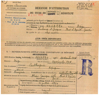 En la referencia de Alsacia se debe referir al campo de Struthof-Natzweiler. En la ficha de deportado político se añaden las circunstancias de su participación en actividades de resistencia del grupo de maquis de Bir Hakeim. Incluye, además, las huellas de los dedos de Diego Navarro. El dossier de Caen cuenta con un certificado de la obtención de nacionalidad francesa con fecha el 17 de septiembre de 1948.