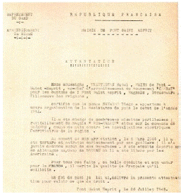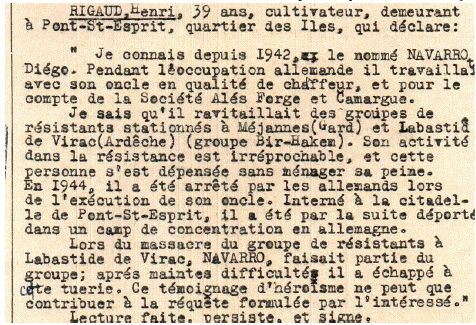 Los responsables militares de la zona de Pont Sant Esprit, Marcel Clement y Etienne, en uno de los atestados con fecha de 20 de enero de 1951, recogen el testimonio oral del testigo Henri Rigaud sobre las circunstancias de la participación en la resistencia y del arresto de Diego Navarro. "Henri Rigaud, 39 años, agricultor, vive en Pont Saint Esprit, distrito de las Islas, quien declara: conozco a Diego Navarro desde 1942. Durante la ocupación alemana trabajó con su tío como chofer y en representación de la Sociedad Ales Forgue y Camargue. Dio Suministro a grupos de luchadores de la Resistencia estacionados en Méjannes (Gard) y Labastide de Virac (Ardéche), grupo Bir Hakeim. Su activismo de resistencia es irreprochable. En 1944 fue arrestado por los alemanes y su tío ejecutado. Prisionero en la ciudadela de Pont Saint Esprit fue deportado a un campo de concentración de Alemania. Durante la matanza del grupo de resistentes de Labastide en Virac con muchas dificultades pudo escapar de la matanza. Este testimonio de heroísmo debe contribuir a la solicitud formulada por el interesado".