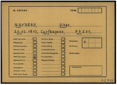 Fuente: "Hoja personal del prisionero Diego Navarro", Dachau, The Arolsen Archives - International Center on Nazi Persecution (antes International Tracing Service, ITS), 1.1.6. / 01010602/ 329273.