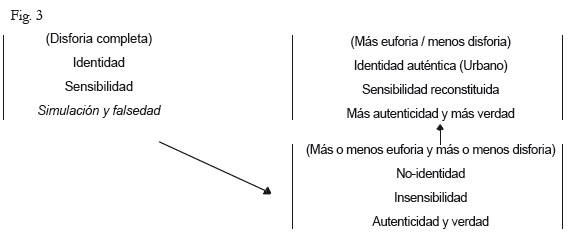 La preocupación del sujeto protagonista frente a su anestesia y su conmoción frente a la recuperación de la sensibilidad, gracias a la conjunción con objetos de valor demeritados por el parecer común, desatarán la segunda de las transformaciones. Alcanzado el estado ya descrito, el sujeto ha perdido todo vínculo tímico y axiológico con el universo cultural, la insensibilidad por la que apostó le convierte en un extraño y su identidad impuesta es ahora una no-identidad. Mas, a pesar de ello, no es posible hablar de euforia completa, pues su hacer le lleva a la necesidad de buscar nuevas formas de sensibilidad: