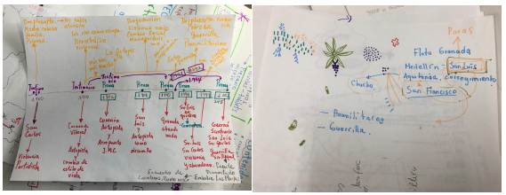 Tras reflexionar sobre los lugares de la memoria y las aplicaciones digitales que favorecen su existencia y difusión, los grupos desarrollaron diversas propuestas creativas. Las ideas incluyeron una línea de tiempo que ilustraba el impacto social y cultural de la carretera; un mapa que integraba capas sonoras y geográficas, contrastando la cotidianidad de la región con sus episodios de violencia; el diseño de una interfaz rotativa con una rosa de los vientos, que permitía acceder aleatoriamente a diferentes archivos de la Ruta 60, simulando procesos de rememoración; y una narrativa basada en el testimonio de Alirio, un conductor que, sin saberlo, transportaba armas, utilizando imágenes de archivo y convenciones cartográficas innovadoras.