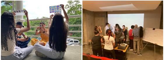 La recolección de datos para la sistematización se llevó a cabo mediante técnicas de observación participativa, que permitieron registrar interacciones, discusiones y el proceso creativo de los participantes a través de notas de campo. Se realizaron diálogos individuales y grupales con los participantes con el propósito de recoger sus percepciones sobre la experiencia en los laboratorios y el impacto de las metodologías empleadas. Además, las actividades fueron documentadas mediante grabaciones de video5 y fotografía, que se utilizaron para complementar el análisis de las interacciones y los productos finales.