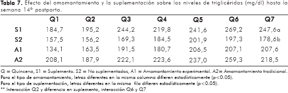 Triglicéridos. Se presentó interacción (p<0.05) entre el amamantamiento experimental y la suplementación en las quincenas 2 y 7 postparto (Tabla 7), reflejado en una mayor concentración de triglicéridos en sangre. Estos resultados podrían ser explicado por la alta concentración de lípidos en la semilla de algodón y por la ausencia de la cría en el tratamiento experimental. En este sistema se obtiene una menor extracción de leche con menor utilización de triglicéridos sanguíneos para la síntesis de la grasa de la leche. Los resultados concuerdan con los de otros autores (28, 31-33). Con respecto a la quincena 6, se encontraron las mayores concentraciones de triglicéridos en el T4 en comparación con T1, T2 y T3, lo que podría obedecer a una mayor lipólisis, como consecuencia de procesos catabólicos, generados en la lactancia tardía (34).