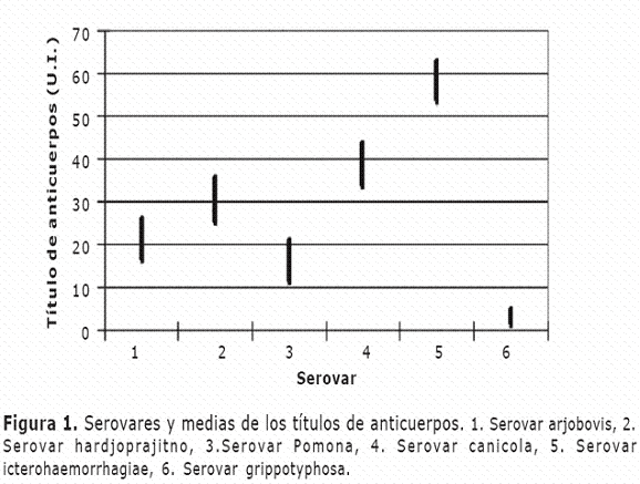 El serovar 6 (L. grippotyphosa) fue el que menos títulos de anticuerpos desarrolló en los bovinos; los serovares 1 y 3 fueron iguales estadísticamente (Figura 1).