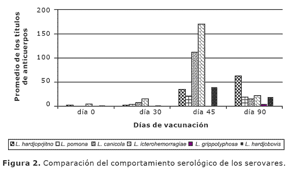 Según los datos obtenidos del análisis estadístico, L. icterohaemorrhagiae fue la que presentó un mayor promedio de títulos de anticuerpos en todas las sangrías postvacunales, haciéndola diferente estadísticamente respecto a las demás (Figura 1).