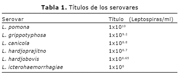 Elaboración de la bacterina. Se probaron dos medios de cultivo diferentes, "Medio A" y "Medio B". El medio EMJH, fue modificado por incremento en la concentración de Tween, suplementado con suero de conejo o suero de ternera al 2% y albúmina sérica bovina. Los medios fueron enriquecidos con Vit.B2 y B12 para estimular el crecimiento (14). Se cultivaron los 6 serovares en los dos medios empleando igual volumen de inóculo e iguales condiciones de incubación. Cada uno de los 6 serovares de L. interrogans (L. hardjobovis, L. hardjoprajitno, L. pomona, L. icterohaemorrhagiae, L. grippotyphosa y L. canicola) provenientes del Centro Panamericano de Zoonosis (Tabla 1). Se cultivaron por separado en 10 ml del medio líquido "A", a ph de 7.2 +/- 0.2 y temperatura controlada de 30oC, durante 5 a 10 días en condiciones de aerobiosis y agitación. Luego se escaló, teniendo en cuenta los mismos parámetros, hasta que se obtuvo un volumen final de 500ml.Las bacterias fueron retiradas del cultivo, una vez lograda la concentración requerida (1x108células/ ml), evaluada por dos métodos diferentes: turbidez, a través del nefelómetro de MacFarland y mediante una adaptación de la técnica de Reed y Muench, para titulaciones de virus empleando la dosis letal 50 (DL50) (15). Se realizaron diluciones de los cultivos con sus dos réplicas, verificando la presencia de leptospiras en estas después de los períodos de incubación. Los resultados se registraron en una tabla similar a la utilizada por el método de Reed y Muench (15) y finalmente se realizó titulación de los cultivos.