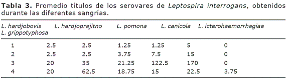 L. canicola y L. icterohaemorrhagiae arrojaron resultados de titulación parecidos en los que se observó inicialmente ausencia de títulos, pero  estos progresaron con el tiempo (número de sangría) y descendieron rápidamente en la cuarta sangría (Tabla 3). Por el contrario la titulación para L. hardjoprajitno en los bovinos vacunados no presentó variación sino hasta la tercera sangría, y en la cuarta se observó un aumento notorio de anticuerpos, es decir, que no se alcanzó a registrar el descenso de los títulos (Tabla 3). Para el caso de L. hardjobovis en los bovinos vacunados, no se evidenciaron variaciones antes de la vacunación y un mes después de esta. Los títulos aumentaron en la sangría 3, 45 días después de la vacunación y 15 días después de la revacunación; pero en la cuarta sangría este nivel se mantuvo sin cambio en el promedio de anticuerpos. El título de anticuerpos para L. pomona a lo largo de las sangrías fue similar al de L. hardjobovis, sólo varió en los valores de los promedios de los títulos. Además, hubo aumento de anticuerpos después de 30 días de la vacunación y disminución del nivel de inmunoglobulinas entre la tercera y cuarta sangría, es decir, 45 días después de la revacunación. L. grippotyphosa evidenció títulos únicamente hasta la sangría número 4; este serovar, no incrementó títulos durante las sangrías, 1, 2 y 3; los promedios de los títulos detectados en la cuarta sangría, día 90 post vacunación fueron títulos de 3.75 muy inferiores dentro del grupo (Tabla 3).