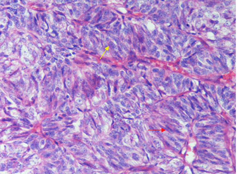 En general las células se ubicaron en diferente orientación al tejido conectivo que hace las veces de membrana basal. Un pequeño foco las células que hacian parte de las estructuras en isla con forma alargada o fusiforme con núcleo de las mismas características un poco mas hipercromático lo cual pudo ser indicativo de mayor actividad celular (Figura 8).