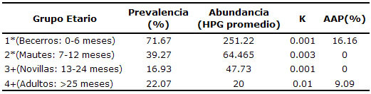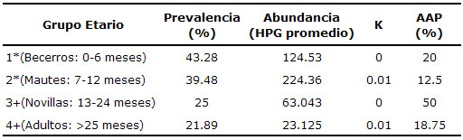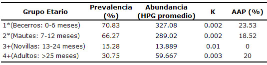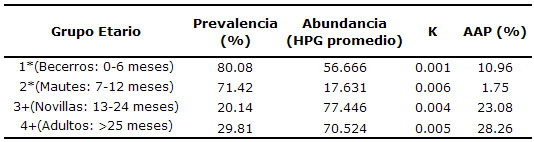 Los animales del grupo etario 3, tuvieron niveles de prevalencia <25%. Las cargas parasitarias promedio estuvieron por debajo de 63 HPG.