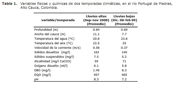Caracterización del hábitat. Para la caracterización del hábitat de la especie se colectaron muestras de agua en frascos plásticos de un litro, durante los periodos lluvias altas (desde Septiembre hasta noviembre de 2008) y en lluvias bajas (desde diciembre del 2008 hasta febrero del 2009). En el laboratorio se determinaron las siguientes variables: demanda bioquímica de oxigeno (DBO), titulando oxigeno disuelto pasado cinco días por el método Winkler, alcalinidad y sólidos disueltos, oxígeno disuelto y pH se determinaron por titulación de acuerdo a métodos estándares (16). Además, in situ fueron medidas variables físicas del cauce tales como ancho, profundidad, tipo de sustrato y temperatura del aire y del agua.