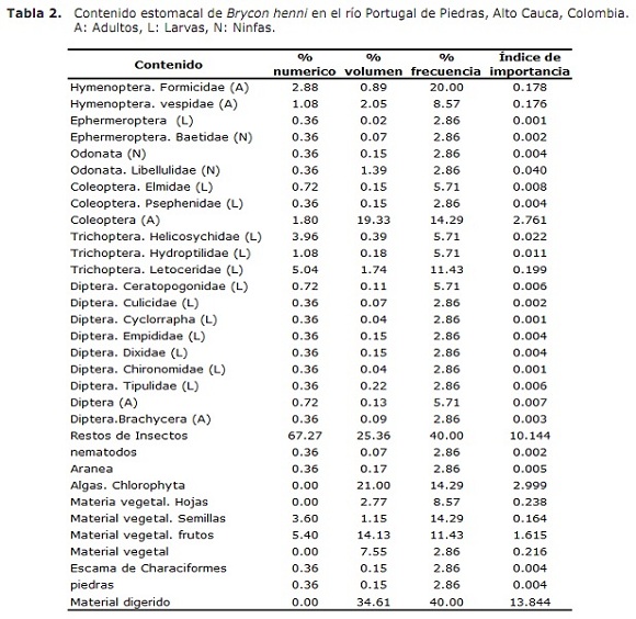 Trophic ecology of Brycon henni (Pisces: Characidae) in the Portugal de Piedras river, upper Cauca basin, Colombia