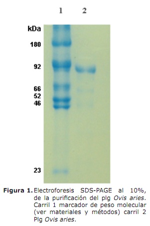 Análisis electroforético. La pureza del Plg Ovis aries se determinó mayor al 95% (Figura 1, carril 2) esta banda migra aproximadamente a la misma altura que el Plg humano utilizado en el marcador de peso molecular, carril 1 banda 2 de 92 kDa.