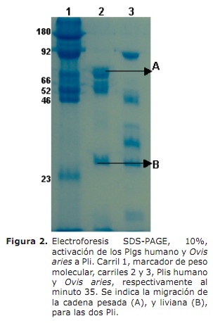 La purificación del Plg de muchos mamíferos se ha realizado por el mismo método (8,9). El aislamiento del Plg de Ovis aries del plasma de este, demuestra definitivamente que el Plg de los mamíferos y quizás de cualquier especie se pueda purificar por el método reformado de Cañas et al (8) unificando así la purificación de esta molécula, la alta pureza de la purificación fue confirmada por las secuencias de los Plgs, ya que solo se encontró una sola secuencia en cada preparación, se debe tener en cuenta que el método utilizado para la determinación del terminal-N, detecta cantidades tan bajas como 1 nanogramo de proteína. Estas secuencias se diferenciaron entre las dos especies en solo dos a.a., resultados que están en concordancia con otros estudios realizados (8-10). Los Plg de las dos especies en estudio, fueron activados, demostrándose que el plg del humano se activa totalmente formando las típicas bandas pesada y liviana, mientras que el Plg del Ovis aries, mostró una resistencia a la activación total, aunque las cadenas pesada y liviana se degradan más rápidamente, que la humana.
