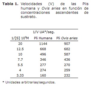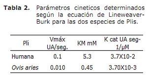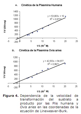 Cinética de la plasmina. Los parámetros cinéticos de las dos Plis fueron determinados en la figura 4 (A y B), en las coordenadas de Lineweaver-Burk, donde se observa el comportamiento de las Plis. Los resultados de los parámetros de la cinética de la Pli Ovis aries se resumen (Tabla 1, columna 3), comparandose con los parámetros de la Pli humana (Tabla 1, columna 2). Los parámetros de importancia cinética de las dos especies de Plis se resumen y comparan en la tabla 2.