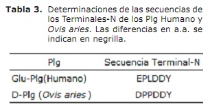 Secuenciamiento del terminal-N de los Plgs humano y Ovis aries. La secuencia del terminal-N de ambas especies de Plgs se aprecia en la tabla 3, las diferencias entre las dos especies se muestran en negrilla.