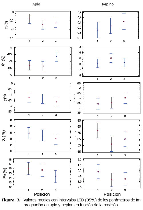 Caracterización del proceso de impregnación al vacío. Para el apio y el pepino, el ANOVA no mostró diferencias significativas (p>0.05) en ninguna de las variables de impregnación con respecto al factor posición. Se observan valores promedios negativos para el parámetro X1 en el apio (-14.32±2.75%) y en el pepino (-5.51±1.76%), lo cual representa una pérdida de líquido nativo desde el interior de la estructura durante la etapa de vacío, atribuido principalmente al tiempo y presión de vacío aplicado, que hace que el alto contenido de humedad en los espacios intercelulares migre hacía el líquido de impregnación. En el apio, la posición 3 presenta una tendencia de menor pérdida de líquido nativo, lo cual podría asociarse a que esta zona es más cercana al punto de disposición final del agua que es conducida hacia las hojas por el sistema vascular del tallo; para el caso del pepino este fenómeno fue más uniforme. La salida de líquido nativo como respuesta al proceso IV en estructuras vegetales, ha sido reportado en zanahoria, berenjena y remolacha (13), en uchuva impregnada con soluciones de microorganismos probióticos (26), en plátano impregnado con soluciones antipardeantes (27), en hongos Pleurotus ostreatus impregnados con soluciones conservantes (28), entre otros.