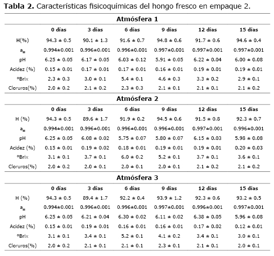 Evolución de los parámetros fisicoquímicos. Los cambios en los °Brix, durante el almacenamiento, están asociados principalmente al desdoblamiento de los carbohidratos presentes (rompimiento de los polisacáridos en monosacáridos) (25) y a la deshidratación progresiva del producto por la diferencia de potencial químico entre el producto y la atmósfera (26); cuyo resultado es el incremento del contenido de azucares en el producto durante los primeros seis días y posteriormente tiende a establecer el equilibrio al final del almacenamiento. Este comportamiento ocurrió en todos los empaques, con una mayor intensidad en el empacado comercial (muestra control), seguido del empaque 2 para la atmósfera 2, y concuerda con estudios previos realizados en Agrocybe chaxingu empacados en atmósfera modificada (5% O2, 10% CO2, 85% N2) (17).