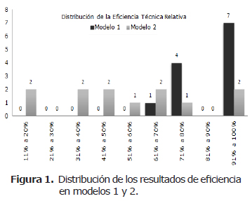 La distribución de los resultados de eficiencia de los modelos 1 y 2 muestra que las eficiencias del modelo 1 se encuentran entre el rango del 61% y el 100%. Sin embargo, las eficiencias del modelo 2 están en el rango del 11% al 100%. De hecho, el 100% de las fincas en el modelo 1, tienen su eficiencia por encima del 67%. Situación que no se puede observar en el modelo 2, donde el 50% de las fincas tienen su eficiencia por debajo del 50% (Figura 1).