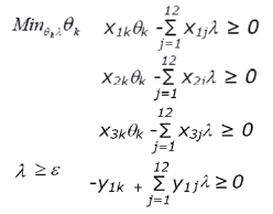 El valor minimizado de θk teniendo en cuenta las tres primeras restricciones dará como resultado la eficiencia para esta finca.λ es el escalar que multiplica a la matriz de entradas y salidas de todas las fincas j. Su restricción vienen dada por la última ecuación que supone que esté restringida a ser mayor o igual a una cantidad mínima ε, con el objeto de evitar que algunas de las entradas o la propia salida o salidas (modelo 2) sean totalmente ignoradas en la determinación de la eficiencia.