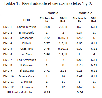 El valor promedio de la eficiencia para el modelo 1 es del 88%, significa que las fincas podrían producir la misma cantidad de producto con el 88% de las entradas que actualmente utiliza; es decir, están sacrificando un margen de ahorro del 12%. En el modelo 2, las cifras son menos alentadoras porque la producción actual la podrían hacer utilizando solo el 56% de las entradas actuales y estarían ahorrando un margen del 44% (Tabla 1).