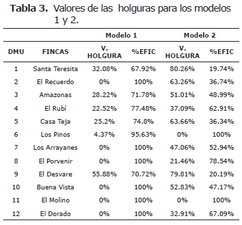 Ahora bien, la más ineficiente en ambos modelos es la Finca Santa Teresita DMU 1, ésta presenta los valores de holgura más altos 32.08% y 80.26% respectivamente. Esto significa que tiene niveles de utilización de recursos por encima de los considerados como eficientes. En otras palabras, las variables de holgura en las entradas significan que las entradas deben ser reducidas en este valor de holgura para obtener la misma cantidad de salidas; y solo así podría llegar a un nivel de eficiencia igual a 1 (Tabla 3).