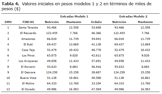 Por ejemplo, en el modelo 1 la DMU 1 es la más ineficiente (Finca Santa Teresita), presentó un valor de holgura del 32.08% (Tabla 3); esta finca, tiene valores iniciales de entrada para nutrición, mantenimiento y ordeño de $93.466; $12.558 y $53.600 correspondientemente (Tabla 4). En efecto, el reporte de nivel objetivo de entradas arroja los valores: $63.477, $8.529 y $36.402 para nutrición, mantenimiento y ordeño respectivamente (Tabla 5); que es precisamente, tomar los valores iniciales y restarles el porcentaje arrojado por el valor de holgura de esta finca.