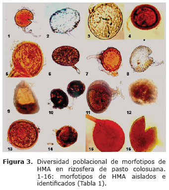 El 96.9% de los aislamiento de HMA correspondieron a especies con características similares género Glomus y 3.1% al género Gigaspora. Los resultados indicaron que existe baja diversidad de géneros de HMA asociados al pasto colosuana, pero por las características de los morfotipos identificados existe una alta diversidad de especies dentro del género Glomus. El pastoreo continuo a que son sometidos las fincas ganaderas objeto del presente estudios, crea un ambiente desfavorables que afecta de manera directa la presencia y la diversidad y favorece la tolerancia y adaptación de ciertas especies a estas condiciones (21,22).