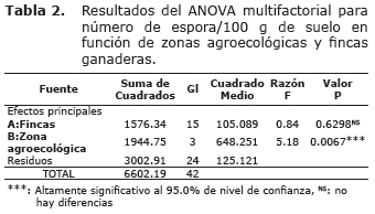 Análisis estadístico. La relación entre las variables densidad poblacional (número de espora/100 g de suelo) y colonización (%) en función de zonas agroecológicas y fincas, se realizó mediante ANOVA multifactorial (15). Se Realizaron varias pruebas y gráficas para determinar qué factores tuvieron un efecto estadísticamente significativo sobre las variables. Se evaluó la significancia de las interacciones entre los factores, las cuales fueron evidenciadas de acuerdo con los resultados de las pruebas-f obtenida mediante ANOVA lo que permitió identificar los factores de mayor significancia. Los datos numéricos fueron analizados en el programa estadístico R (16).