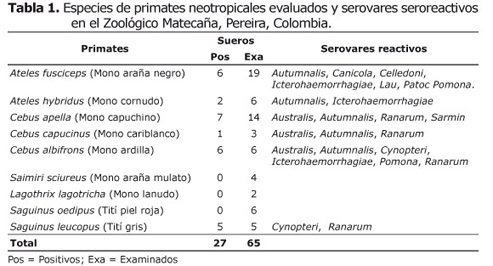 La seroprevalencia de Lectospira sp., en la población de primates neotropicales evaluados fue del 41.5% (27/65). Los monos neotropicales mono ardilla (Saimiri sciureus), mono lanudo (Lagothrix lagotricha) y tití pielroja (Saguinus oedipus) fueron seronegativos (Tabla 1).