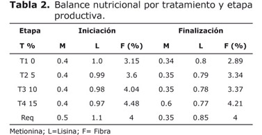 De igual forma es importante mencionar, que el balance dispuesto para cada tratamiento (Tabla 2), buscaba suplir los requerimientos nutricionales necesarios para un óptimo desarrollo fisiológico de los pollos en cada una de las fases; sin embargo al adicionar los tres niveles de inclusión de harina de hoja de bore, se generó un aumento de la fibra; siendo el tratamiento testigo (T1) el de menor concentración de esta (3.15%) y los tratamientos T2, T3 y T4 los de mayor nivel con 3.6, 4.04, 4.48% respectivamente, para la etapa de iniciación. Esta diferencia en el balance de las dietas, genera disminución en el consumo presentado por los tratamientos con mayor proporción de bore, ya que excesos de fibra en la ración (>4%) causan efectos negativos sobre la productividad en monogástricos jóvenes, relacionado con la palatabilidad, reducción de digestibilidad de los nutrientes y sensación de saciedad, haciendo que el pollo sea incapaz de consumir la cantidad de alimento necesaria, para cubrir sus necesidades energéticas (6).
