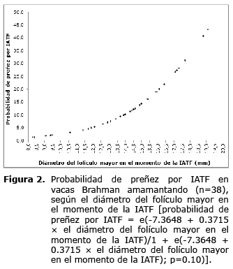 La tasa de preñez por IATF (variable binaria) fue analizada mediante regresión logística, considerando como factores en el modelo la CC, el diámetro del folículo mayor y las concentraciones plasmáticas de estradiol. El modelo final sólo conservó el diámetro del folículo mayor, debido a que mostró una tendencia (p=0.10). La curva de regresión logística para la tasa de preñez por IATF y diámetro del folículo mayor fue creada con el coeficiente suministrado por el análisis de datos del programa SAS (12) y la formula Pi=e(ni)/1+e(ni), en la cual la pi es la probabilidad estimada, la n es el intercepto y la i es el estimador del punto.