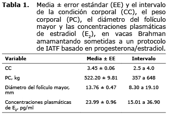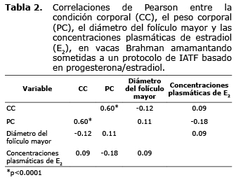 En el presente estudio, no hubo relación entre el diámetro del folículo mayor y las concentraciones plasmáticas de E2. De forma similar, en vacas Angus cruzadas multíparas inducidas a ovular con GnRH+PG+GnRH, el tamaño del folículo ovulatorio no influenció las concentraciones sanguíneas de E2 (14). Contrario a esto, en novillas (19) y en vacas de carne (20,21), las concentraciones de E2 en sangre fueron correlacionadas positivamente con el tamaño del folículo dominante.